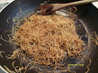 Put olive oil in a skillet on a medium heat, add vermicelli pasta, and stir constantly until pasta turns golden brown. Set aside.